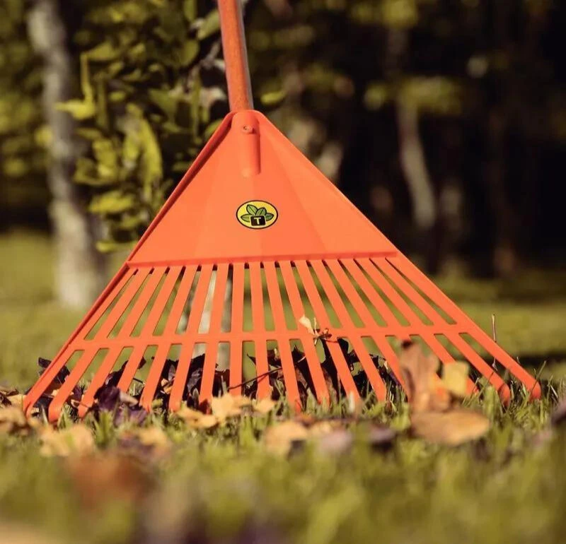 Vassoura plástica laranja Tramontina, com 18 dentes e cabo de madeira de 120 cm. Ideal para manter o gramado limpo e bem cuidado, alcançando até os cantinhos mais difíceis.